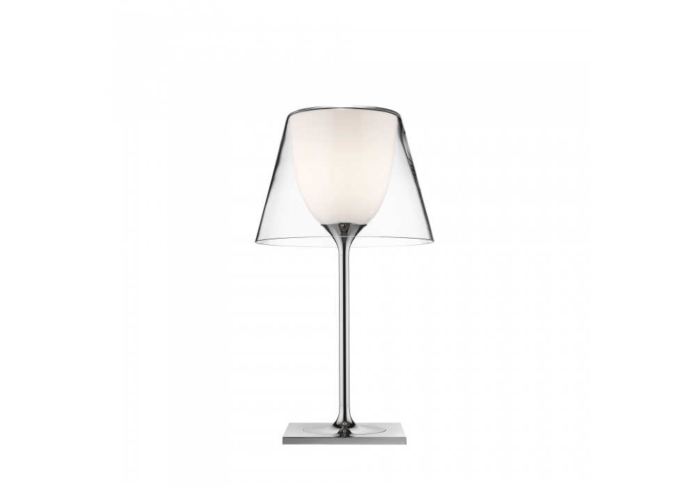 Ktribe T1 Glass diseñada por Philippe Starck para Flos es una lámpara de mesa de luz difusa. Base, soporte de varilla y soporte del difusor en aleación de zamak pulida y fundida a presión. Varilla en tubo de aluminio pulido. Tapa de la base en nailon moldeado por inyección en negro mate. Difusor interno de policarbonato moldeado por inyección en color ópalo. Difusor externo de cristal transparente. Regulador de intensidad integrado. Bombilla no incluida.