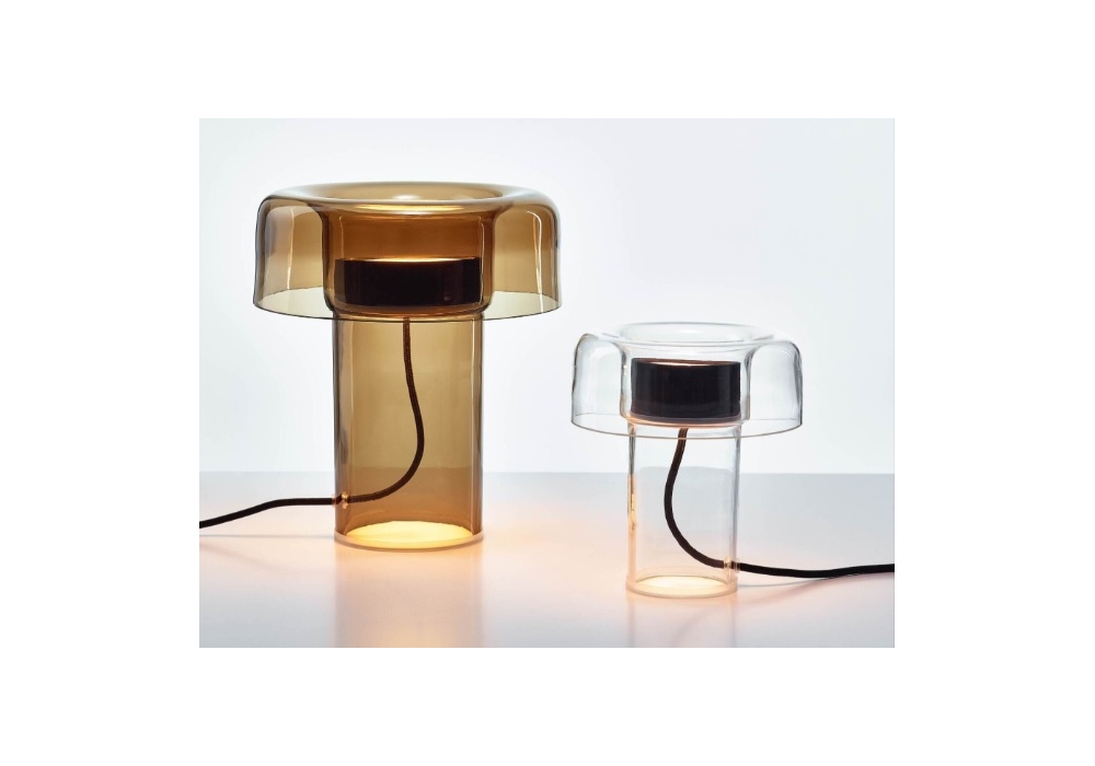 Spectra Mini diseñada por Lucie Koldova para Brokis es una lámpara de mesa de vidrio soplado pulido con diferentes acabados. La fuente de luz es LED regulable. El cuerpo de la lámpara es plateado o negro anodizado a juego con el regulador.