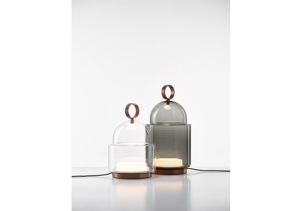 Dome diseñada por el estudio de diseño LCM Marin para Brokis, es una lámpara de mesa de vidrio con acabado brillante, disponible en versión lisa o decorada. El cuerpo es de metal con recubrimiento en polvo o cepillado en varios acabados.