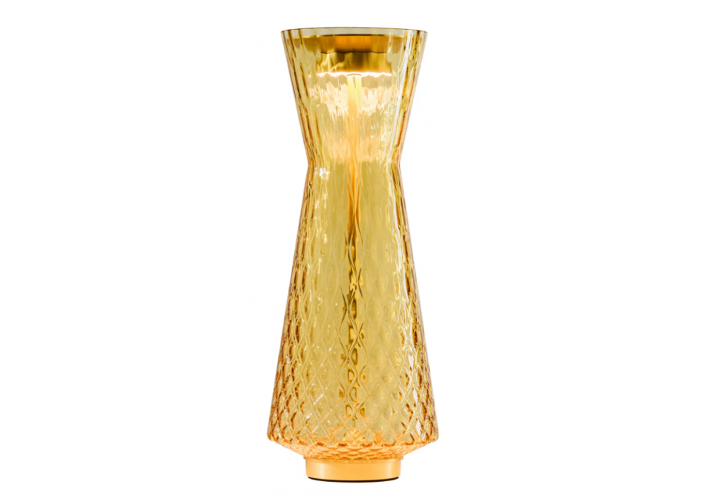 Tiara Luce diseñada por Francesco Lucchese para Venini es una lámpara de mesa con detalles metálicos y difusor de cristal. También disponible en tres acabados.