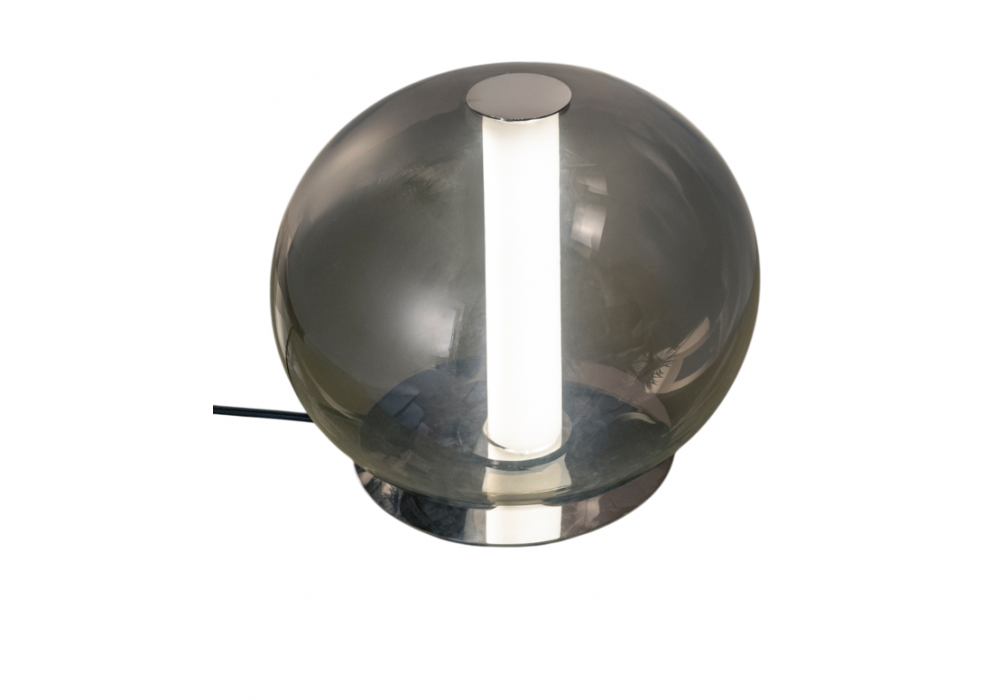 Vetra diseñada por CSM para Casamilano, es una lámpara de sobremesa con difusor de cristal Pyrex ahumado. Base de hierro cromado pulido o alpaca grabada al ácido.
