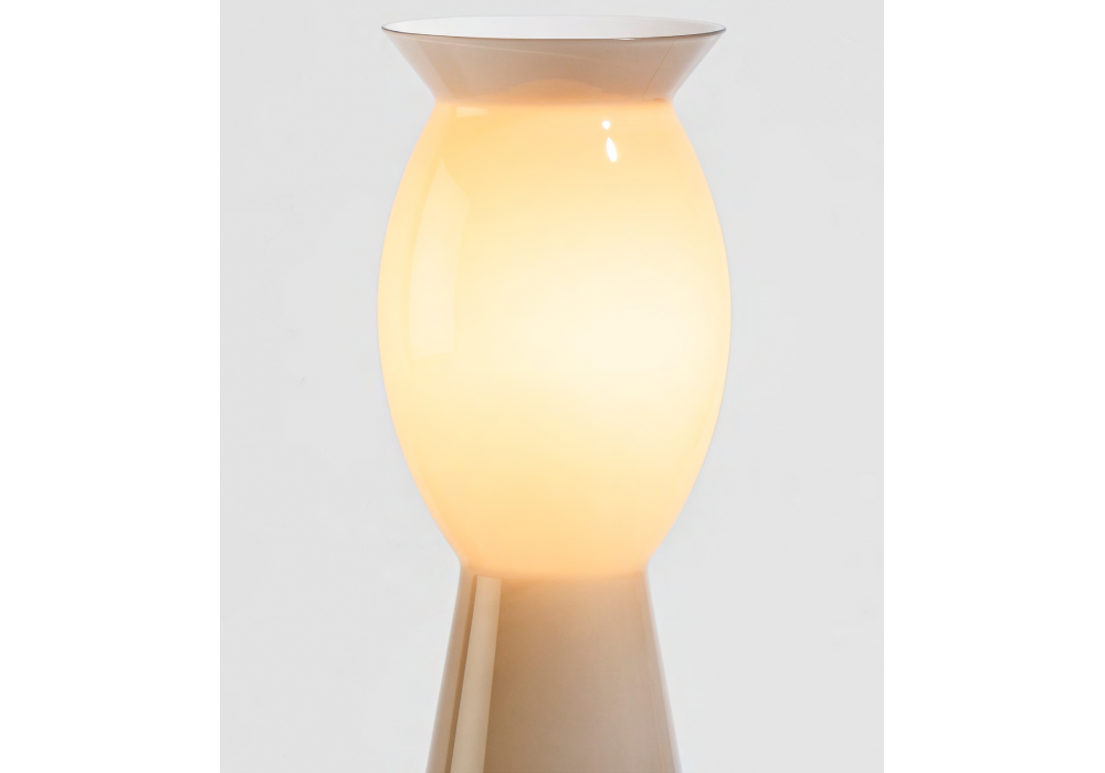 Idalion diseñada por Alessandro Mendini para Venini es una lámpara de mesa inspirada en la colección de jarrones del mismo nombre. Está fabricada íntegramente en cristal soplado de Murano con acabado opalino moka y elaborada artesanalmente por maestros artesanos. La lámpara difunde una luz suave y envolvente, ideal para crear una atmósfera íntima y sugerente, convirtiéndola en la opción perfecta para ambientes elegantes y refinados.