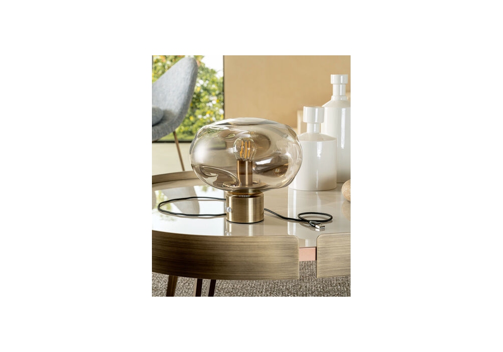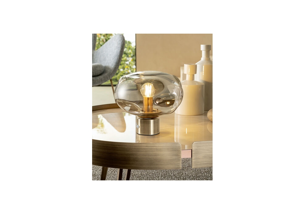 Nubola - T Low diseñada por Riflessi es una lámpara de mesa realizada con una estructura de metal pintado y una esfera de cristal Pyrex soplado y trabajado a mano.