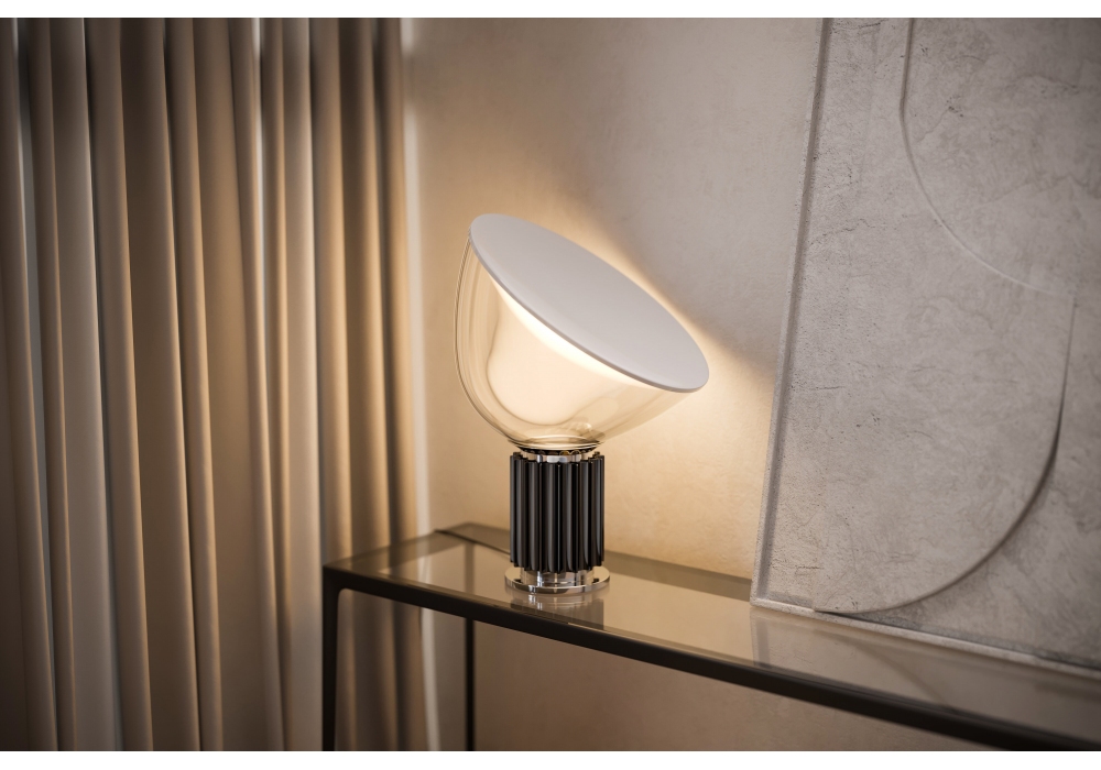 Taccia diseñada por Achille & Pier Giacomo Castiglioni para Flos es una lámpara de mesa con luz indirecta y reflejada. Reflector de metal pintado blanco brillante con líquido en el interior y polvo blanco en el exterior. Difusor orientable de vidrio soplado transparente. Cuerpo de aluminio extruido pintado. Base de acero pulido, niquelado y zapón. Regulador de intensidad y LED incluidos.