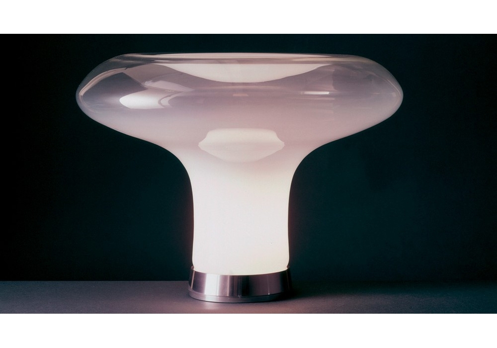 Lesbo diseñada por Angelo Mangiarotti para Artemide es una lámpara de mesa con base circular en aluminio pulido. El difusor está fabricado en vidrio soplado redondeado y adopta una fuente de luz LED regulable.
