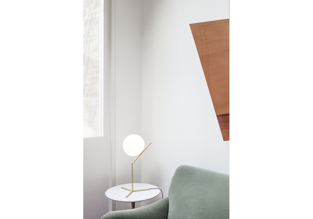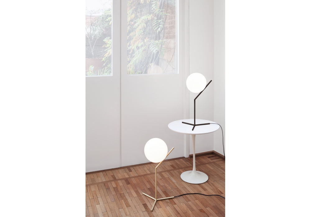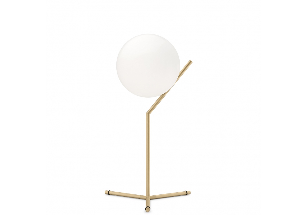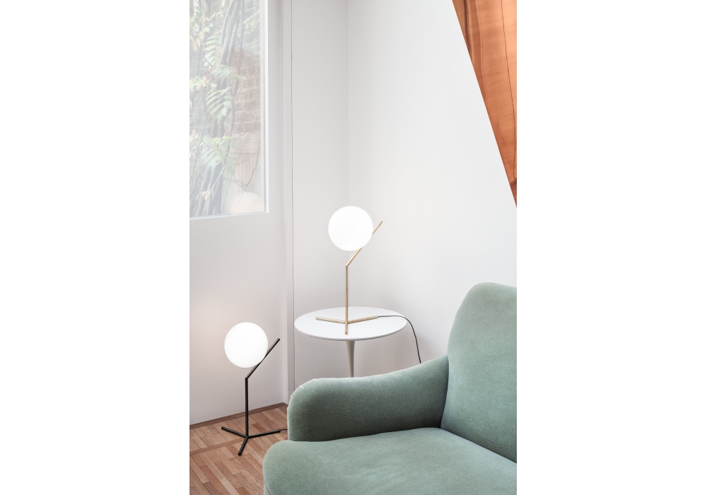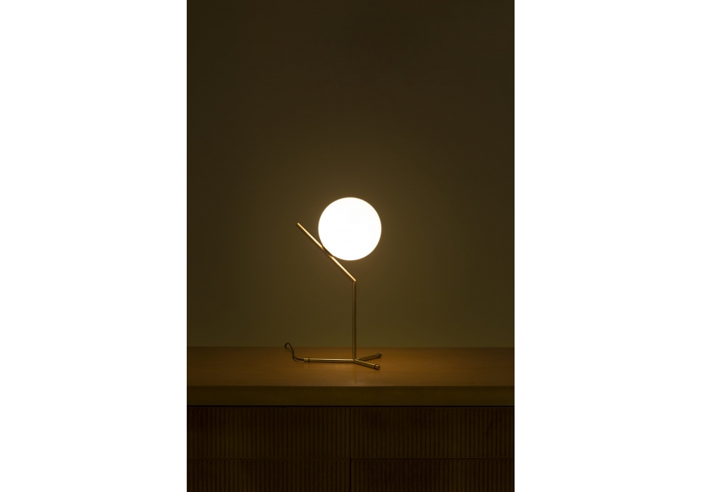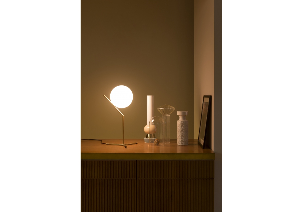 IC T1 diseñada por Michael Anastassiades para Flos es una lámpara de mesa de luz difusa. Estructura de latón, acero negro o cromado. Difusor opalino de vidrio soplado. Regulador de intensidad en el cable de alimentación. Bombilla no incluida.
