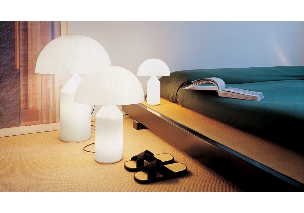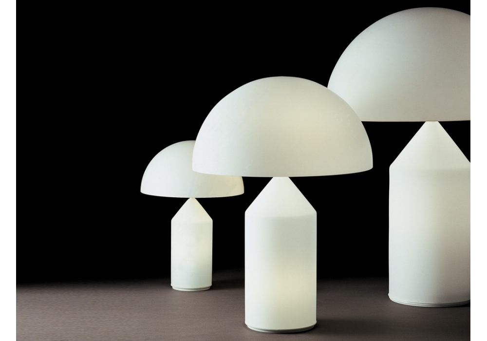 Atollo White diseñada por Vico Magistretti para Oluce es una lámpara de mesa realizada íntegramente en cristal de Murano opal blanco. El difusor tiene forma de cúpula y apantalla una fuente de luz. Atollo White está disponible en diferentes tamaños.