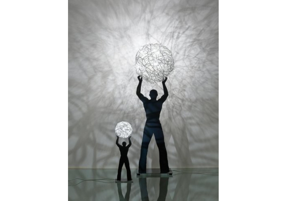 Uomo della Luce S is a floor lamp designed by Enzo Catellani for Catellani & Smith. It is part of the collection Fil De Fer. This lamp is made of natural aluminium wire that has been expertly sculpted and intertwined, waxed rough iron structure, lit up from within by micro bulbs.