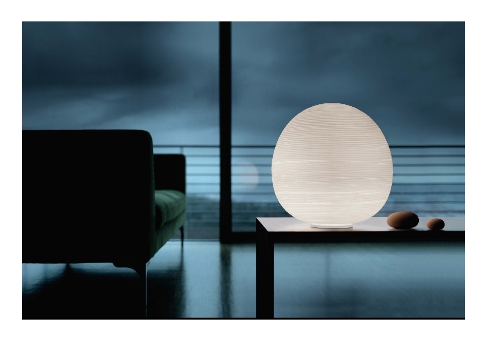 Rituals XL diseñada por Ludovica + Roberto Palomba para Foscarini es una lámpara de mesa con estructura portante de tres patas en metal pintado. El difusor es de vidrio soplado con una superficie enriquecida por incisiones circulares. La fuente de luz es con acoplamiento E27 de tipo LED o halógeno en versión regulable o on/off alimentado por un cable de plástico transparente.