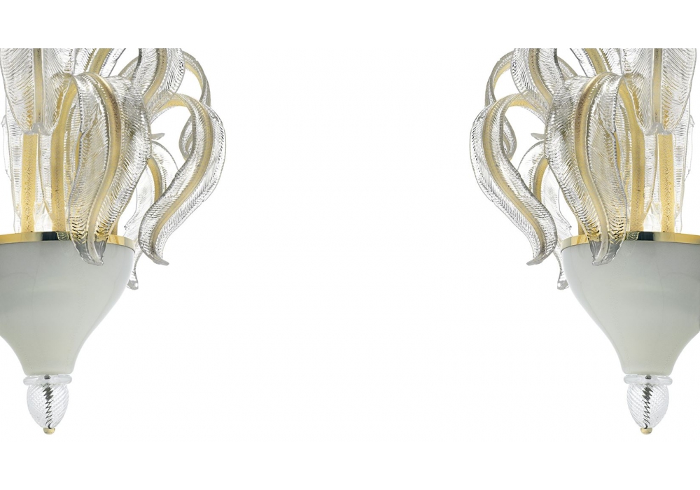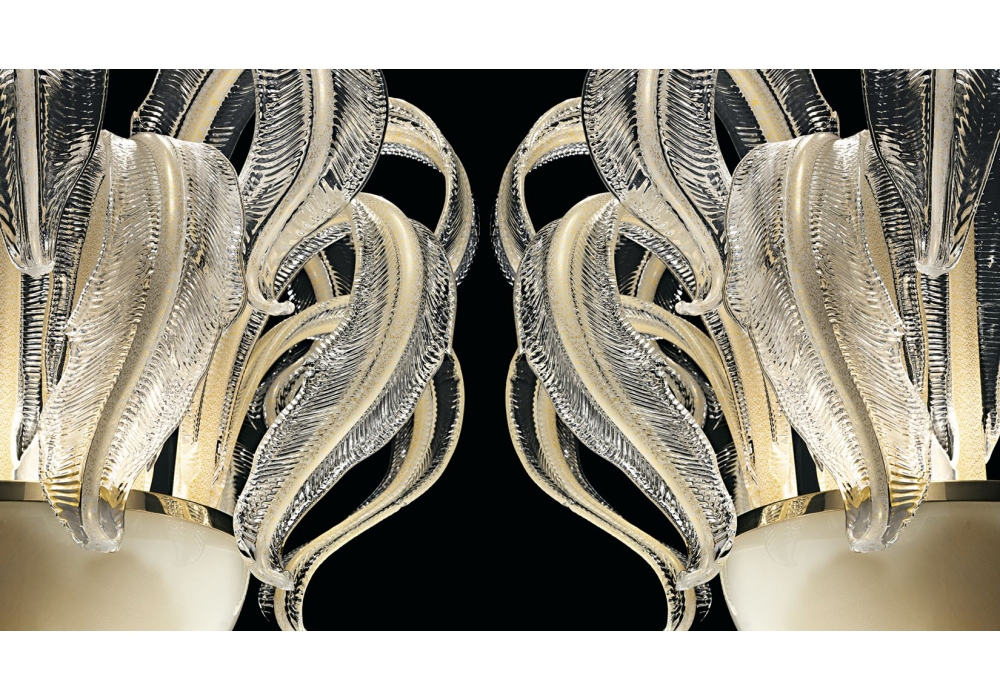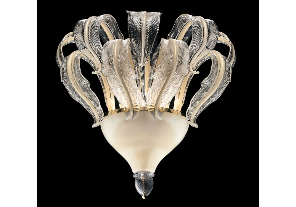 Piume diseñada y producida por Barovier & Toso es una lámpara de pared con estructura en metal galvanizado color oro. El cuerpo de la lámpara y el difusor son de cristal veneciano beige-oro y adopta una fuente de luz LED o halógena regulable. Piume está disponible en diferentes modelos.