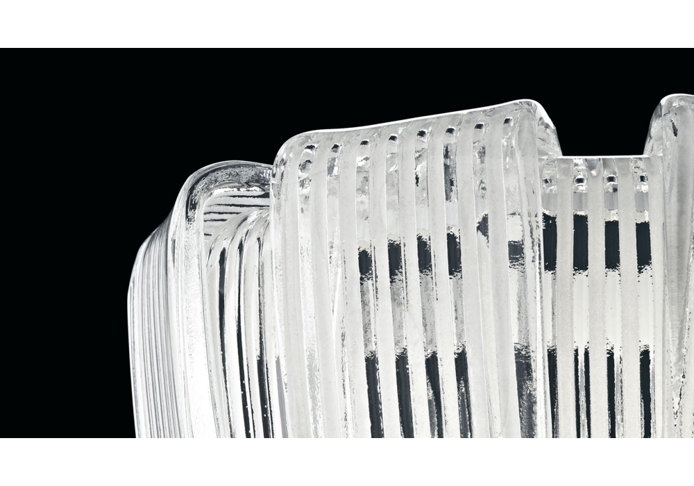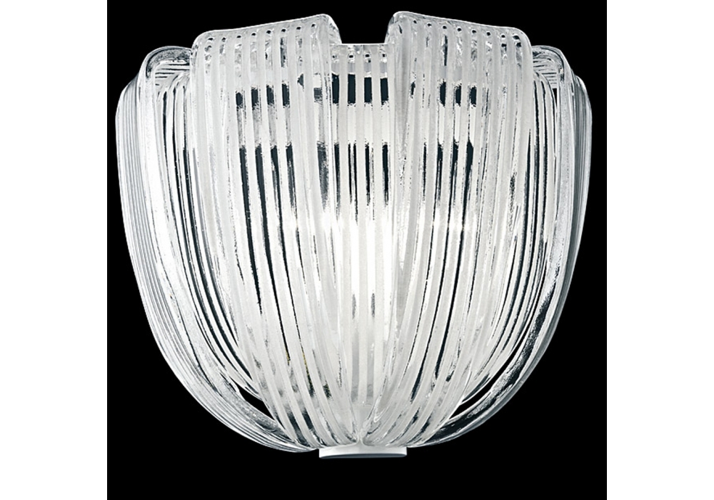 Plissé diseñada y producida por Barovier & Toso es una lámpara de pared con estructura portante y detalles en metal pintado de blanco. El difusor es de cristal veneciano con líneas alternas transparentes y blancas y apantalla las fuentes de luz LED o halógenas regulables.