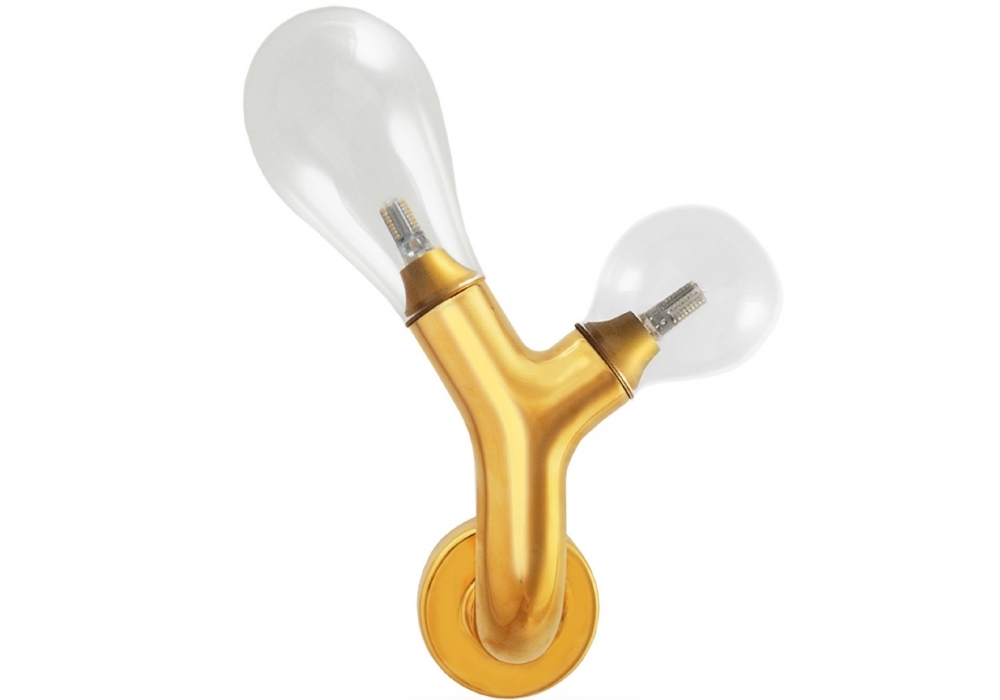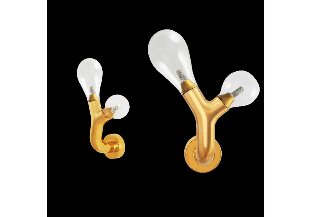 The Double Bulb diseñada por Matteo Cibic para Scarlet Splendor es una lámpara de pared con luz blanca cálida. Está realizado en cerámica con acabado en oro de 24K y cristal soplado a mano.