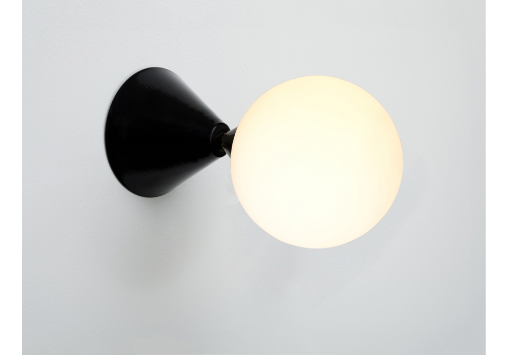 Cone And Sphere diseñado por Atelier Areti es un aplique de pared caracterizado por una estructura de metal pintado en blanco o negro con una pantalla de cristal en forma de esfera. Disponible en dos versiones.
