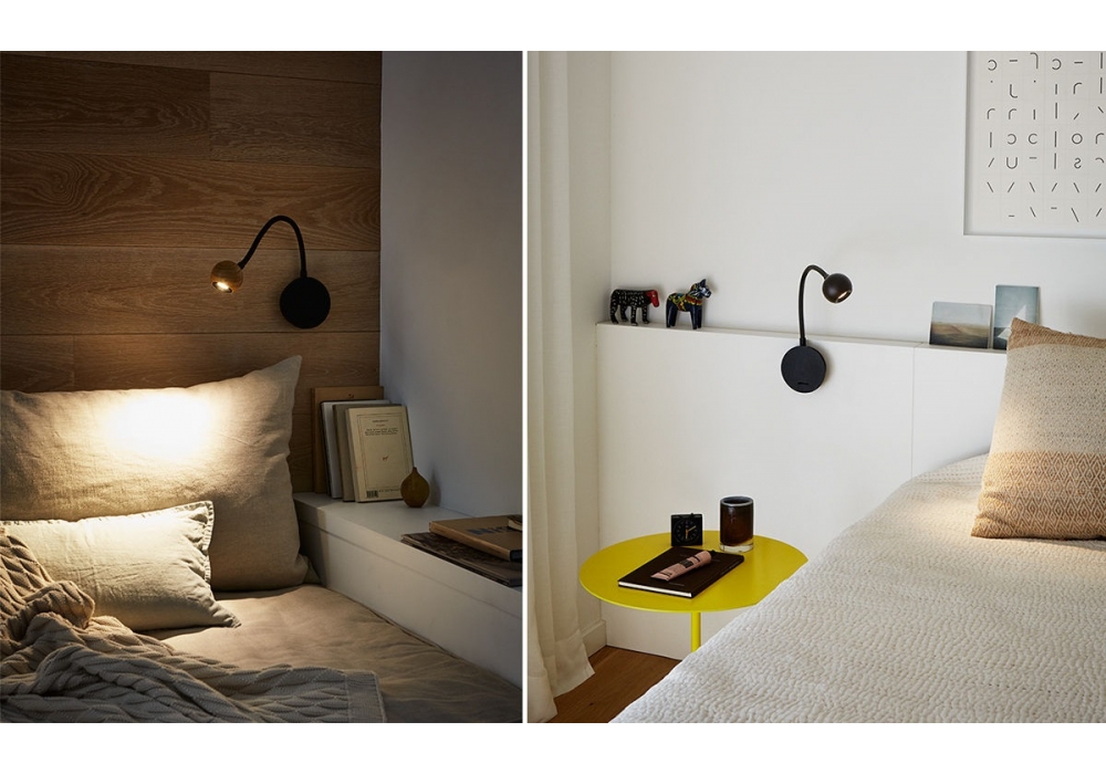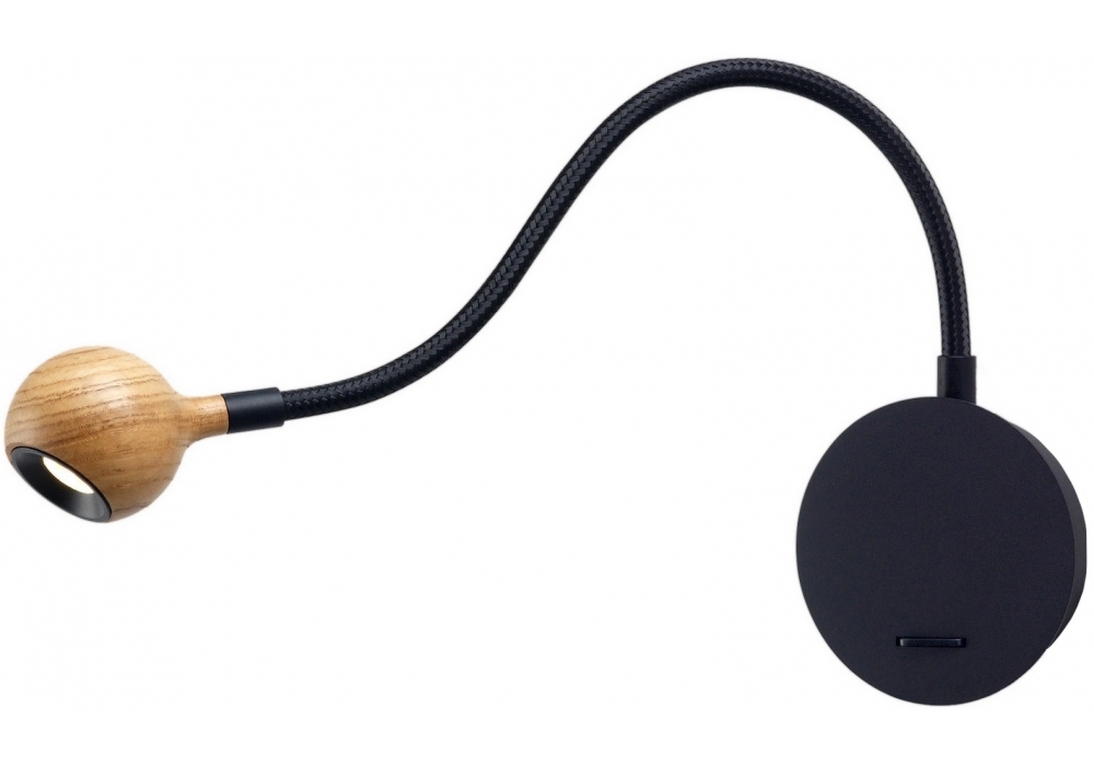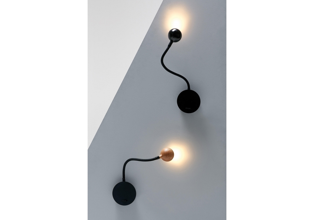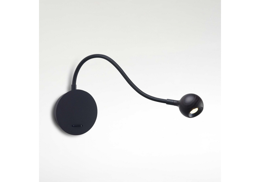 N°8 diseñada por Christophe Mathieu para Marset es una lámpara de pared con flexo negro trenzado. Cabezal torneado en roble o wengué.