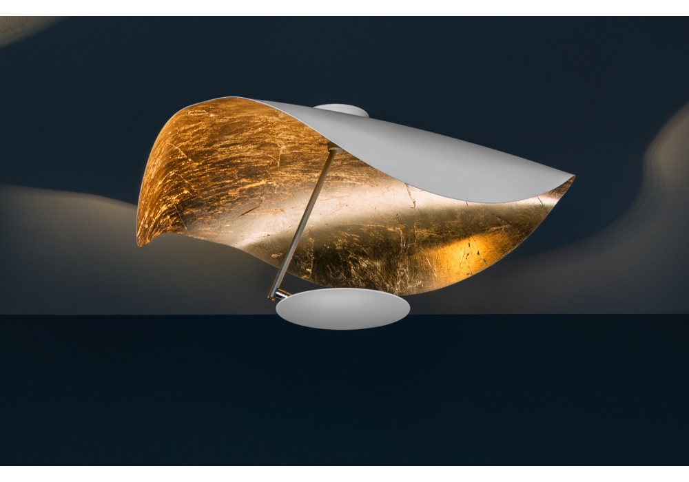 Lederam Manta CWS1 diseñada para Catellani&Smith es una lámpara de techo / pared con pantalla y disco en aluminio. Varilla y base en metal. Disponible en diferentes combinaciones de acabados.