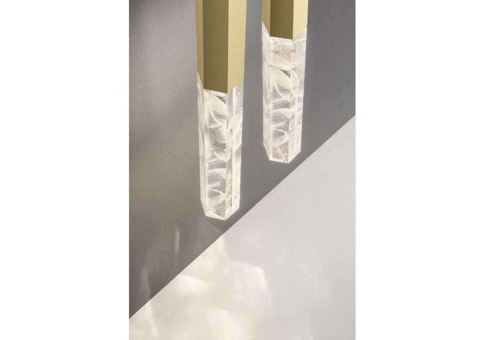 Shine Plumage diseñada por Michele Marcon para Olev es una lámpara de pared LED con un diseño hexagonal original. Contiene plumas decorativas reales.