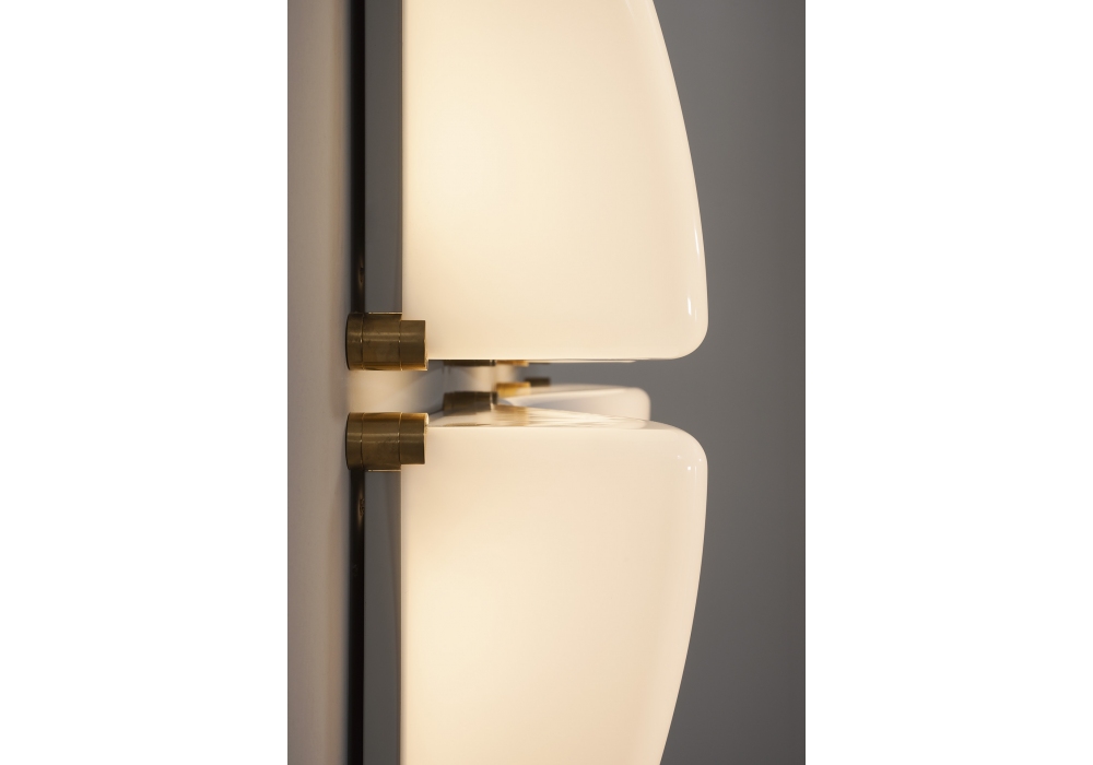 Googie diseñada por Draga&Aurel para Baxter es una lámpara de pared/techo modular con pantalla de ópalo moldeado en blanco. Juntas y detalles en latón satinado con barniz mate.