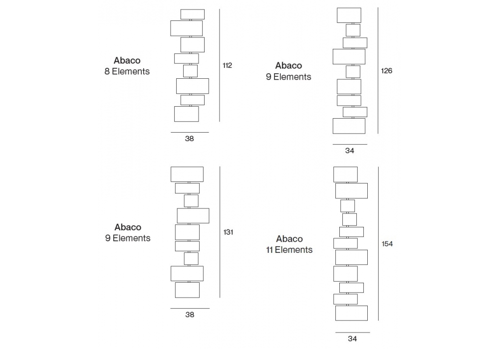 | Dimensiones | 38 x H 112 cm; 34 x H 126 cm; 38 x H 131 cm; 34 x H 154 cm. |