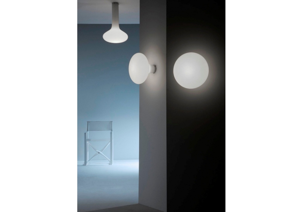 Pin diseñada por Michel Boucquillon para Martinelli Luce es una lámpara de pared o techo con base de aluminio pintado de blanco. El difusor tiene forma circular en polietileno blanco y apantalla una fuente de luz LED.