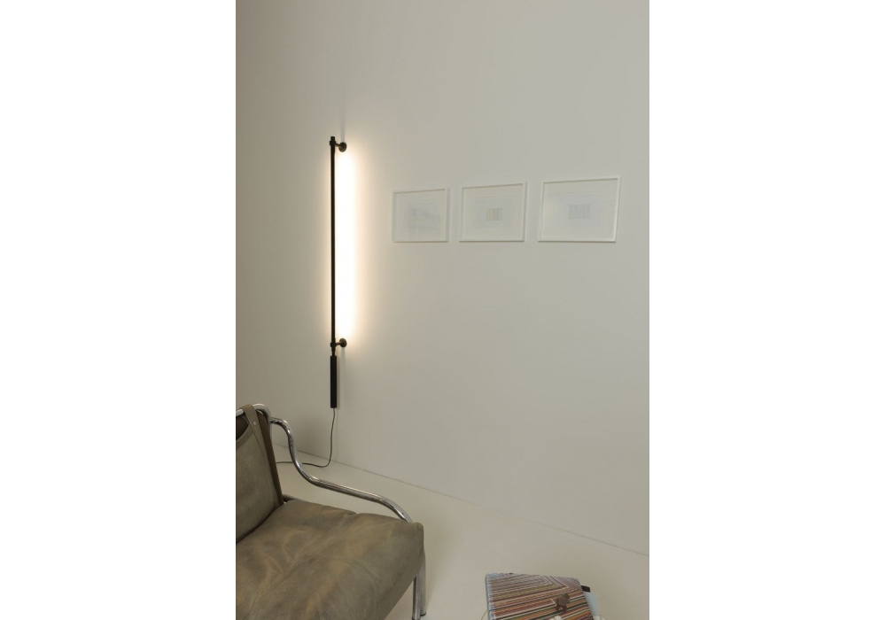 Colibrì 1421 diseñada por Emiliana Martinelli para Martinelli Luce es una lámpara de pared estructurada en tubo de aluminio anodizado negro. El difusor está hecho de material plástico y adopta una fuente de luz LED integrada.