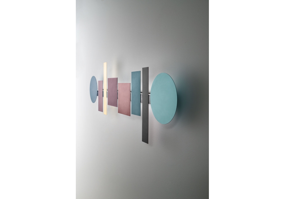 Totem diseñado por Chiaramonte Marin para Pallucco, es un aplique, muy excéntrico en diseño, pero versátil y lúdico, los elementos son móviles e intercambiables gracias a un imán que cubre el perfil exterior, está equipado con luz LED con gradación a 2700 k , los lúmenes y la potencia del haz de luz varían según la preferencia entre Totem A, B, C o D.