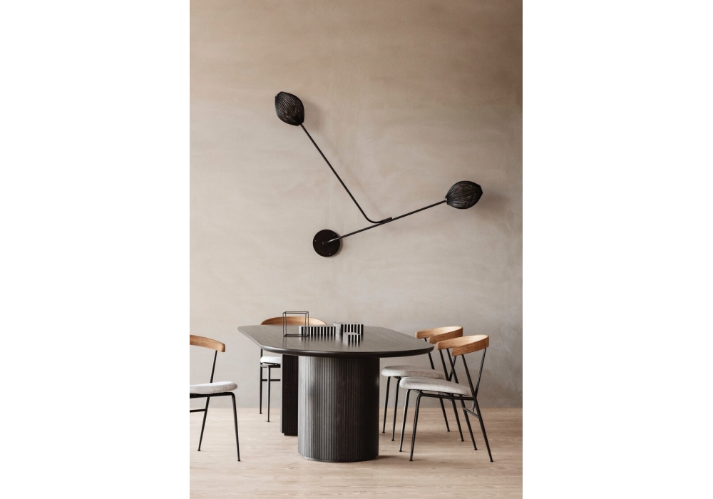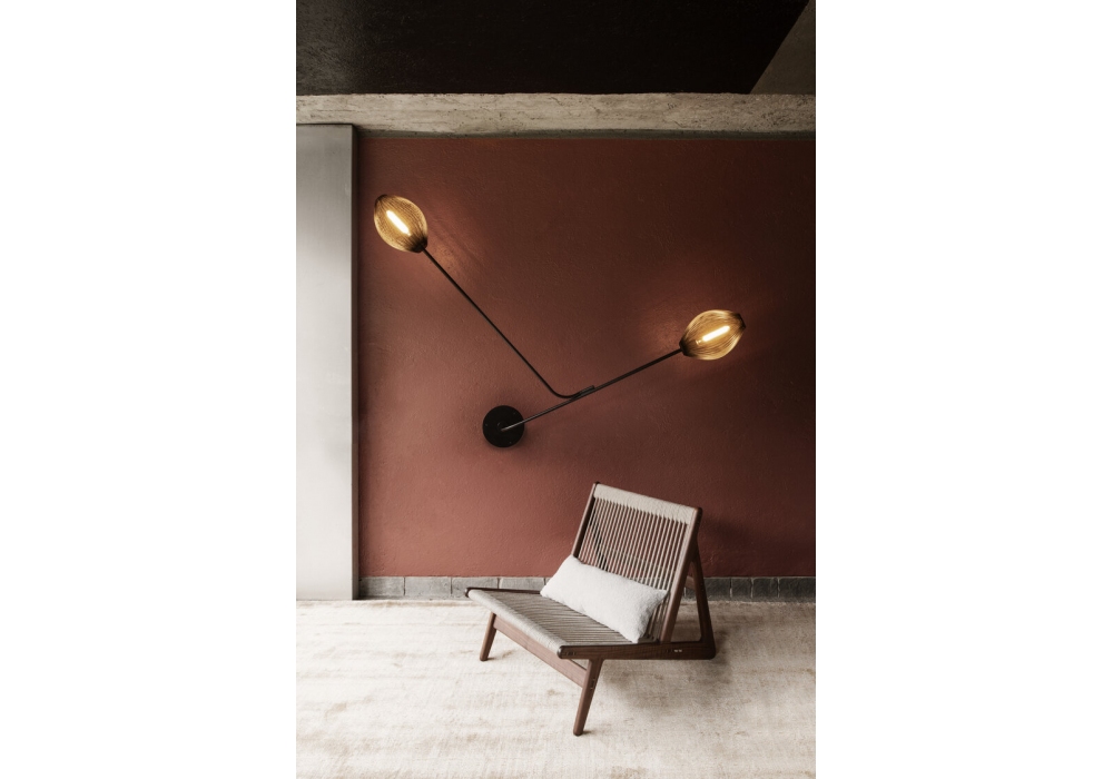 Satellite diseñada por Mathieu Matégot para Gubi es una lámpara de pared que consta de dos pantallas de acero perforado, plegadas en forma de acordeón en forma ovoide y montadas sobre brazos alargados y escultóricos de metal.