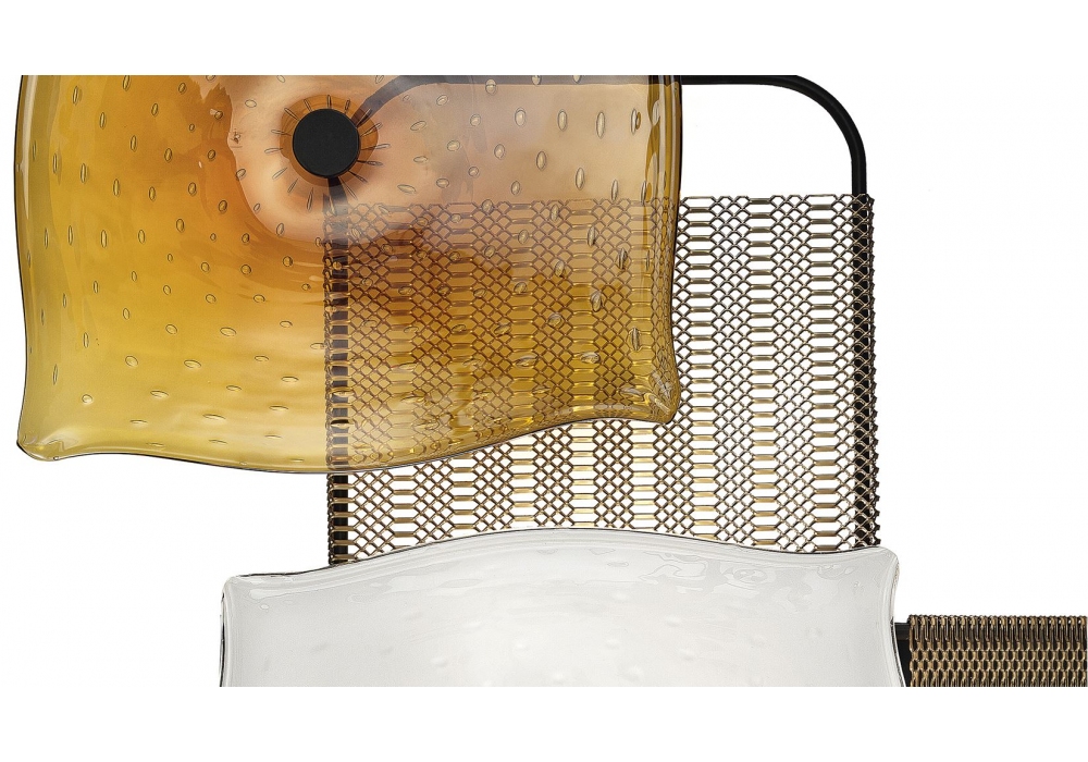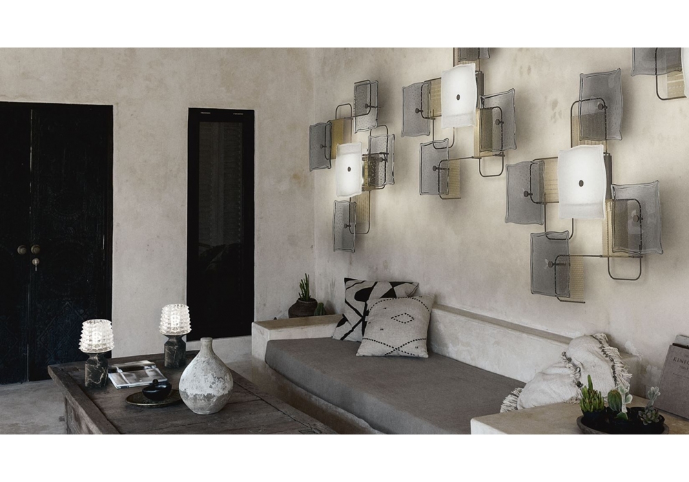 Alumina diseñada por Alessandro Piva para Barovier & Toso es una lámpara de pared con estructura portante en metal color bronce satinado. El difusor está estructurado por cinco aplicaciones cuadrangulares en cristal veneciano y fuentes de luz LED regulables en pantalla. Alumina está disponible en diferentes acabados de vidrio.
