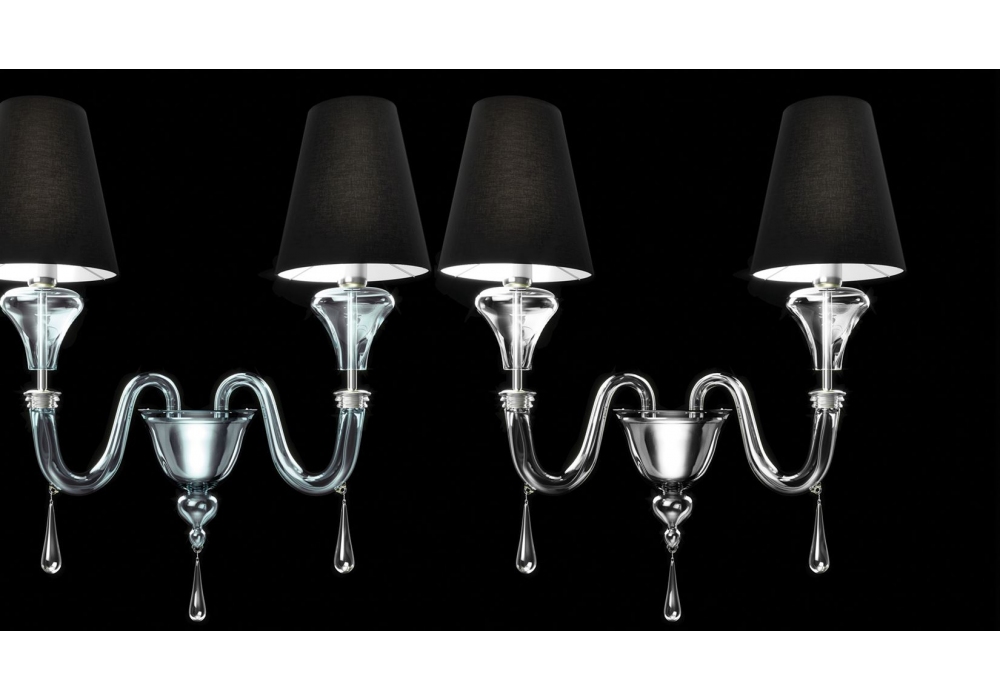 Maryland diseñada y producida por Barovier & Toso es una lámpara de pared con estructura portante de metal con detalles en oro galvanizado o cromo pulido. Los brazos y el cuerpo de la lámpara están cubiertos de cristal veneciano con colgantes de cristal. Las pantallas son de tela y protegen fuentes de luz LED o halógenas regulables. Maryland
