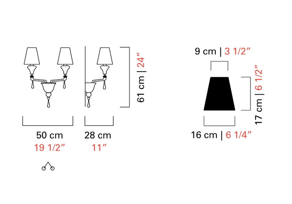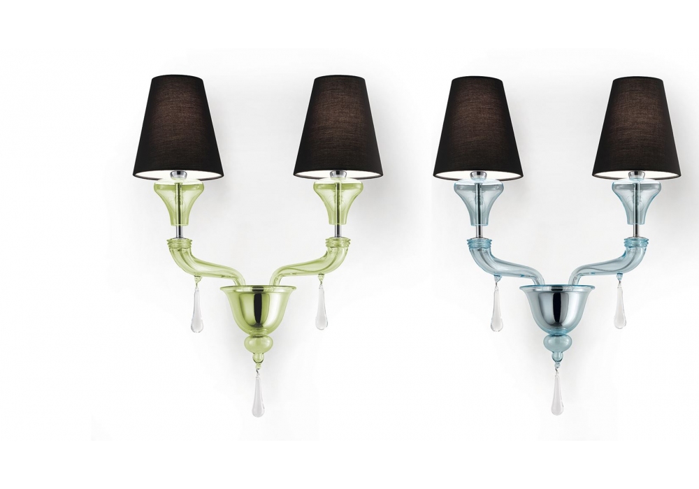 Nevada diseñada y producida por Barovier & Toso es una lámpara de pared con estructura portante de metal con detalles en oro galvanizado o cromo pulido. Los brazos y el cuerpo de la lámpara están cubiertos de cristal veneciano con colgantes de cristal. Las pantallas son de tela y protegen fuentes de luz LED o halógenas regulables. Nevada está disponible en diferentes acabados.