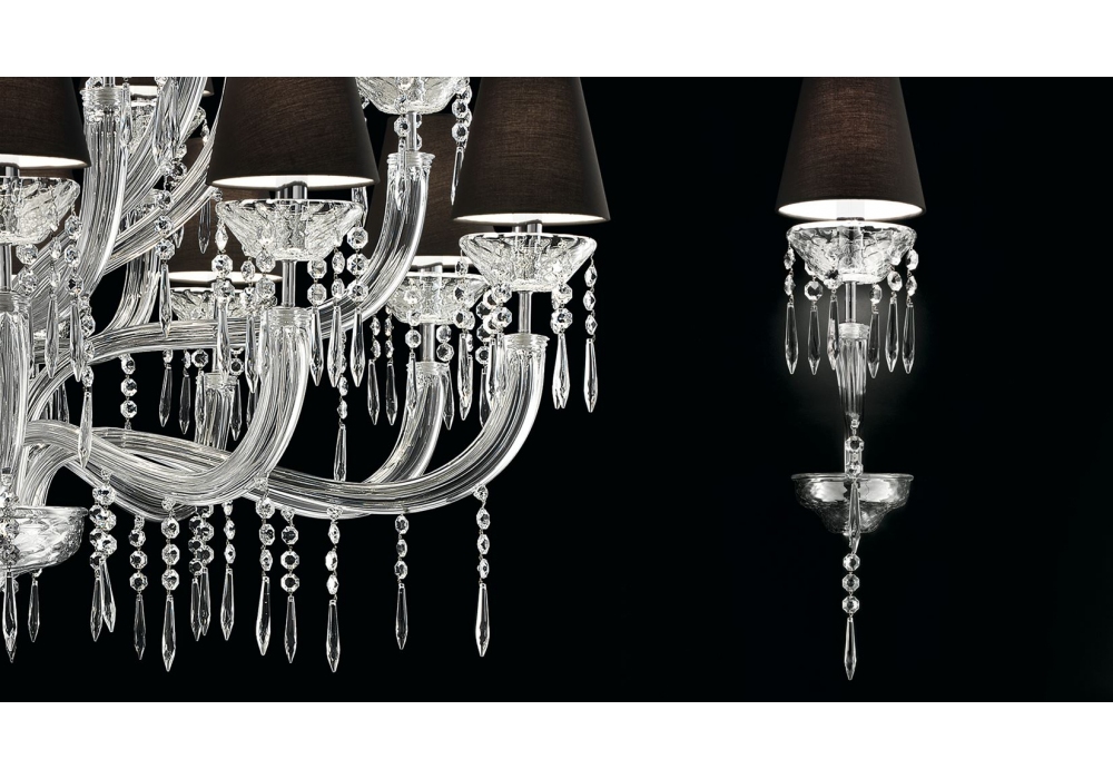 Président diseñada y producida por Barovier & Toso es una lámpara de pared con estructura portante de metal con detalles en oro galvanizado o cromo pulido. Los brazos y el cuerpo de la lámpara están cubiertos de cristal veneciano con colgantes de cristal. Las pantallas son de tela y protegen fuentes de luz LED o halógenas regulables. Président está disponible en diferentes modelos y acabados.