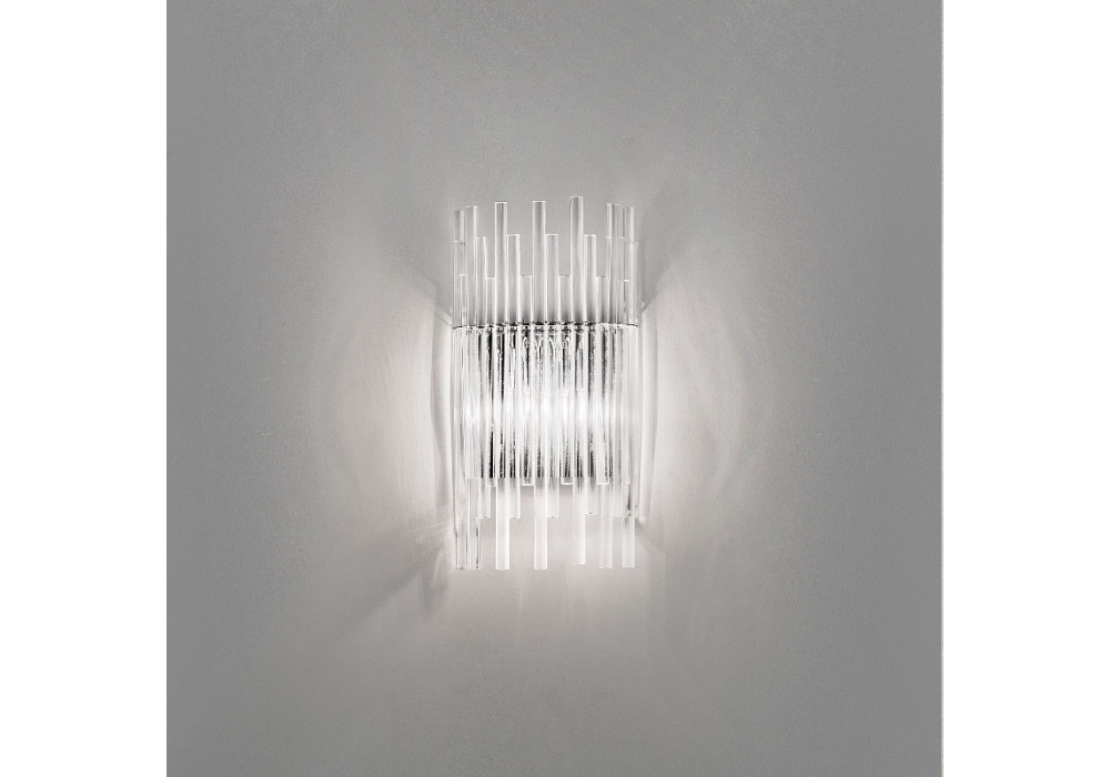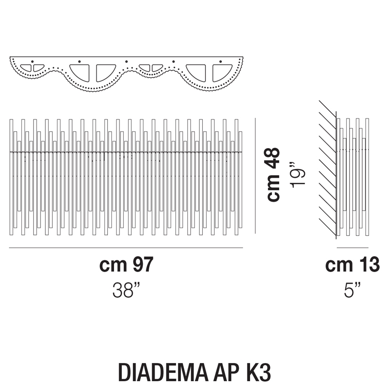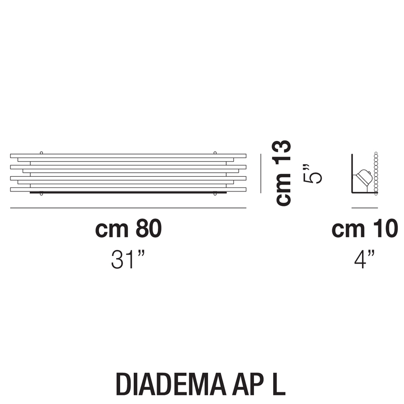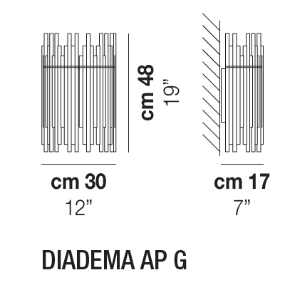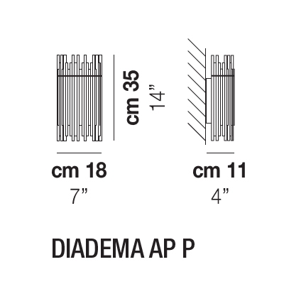 Diadema diseñada por Romani Saccani Architetti Associati para Vistosi es una lámpara de pared con estructura portante en metal pintado. El difusor está estructurado por una serie de elementos tubulares de cristal colocados uno al lado del otro y protegen una fuente de luz con conexión E27/G9/R7S de tipo LED o halógena regulable. Diadema está disponible en diferentes modelos.