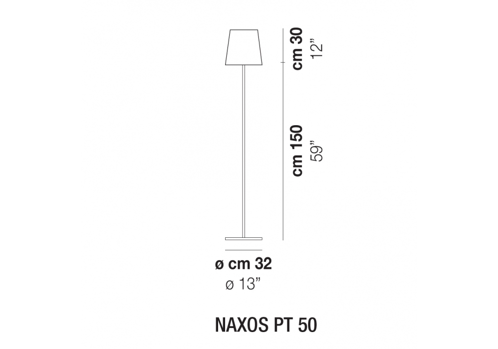 Naxos diseñada y producida por Vistosi es una lámpara de pie con base circular y barra vertical en metal color níquel. El difusor circular es de cristal blanco satinado y adopta una fuente de luz LED o halógena con casquillo E27.