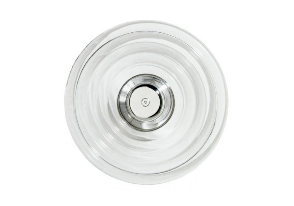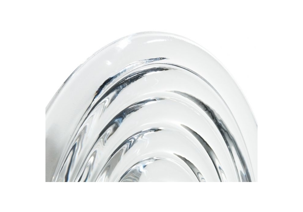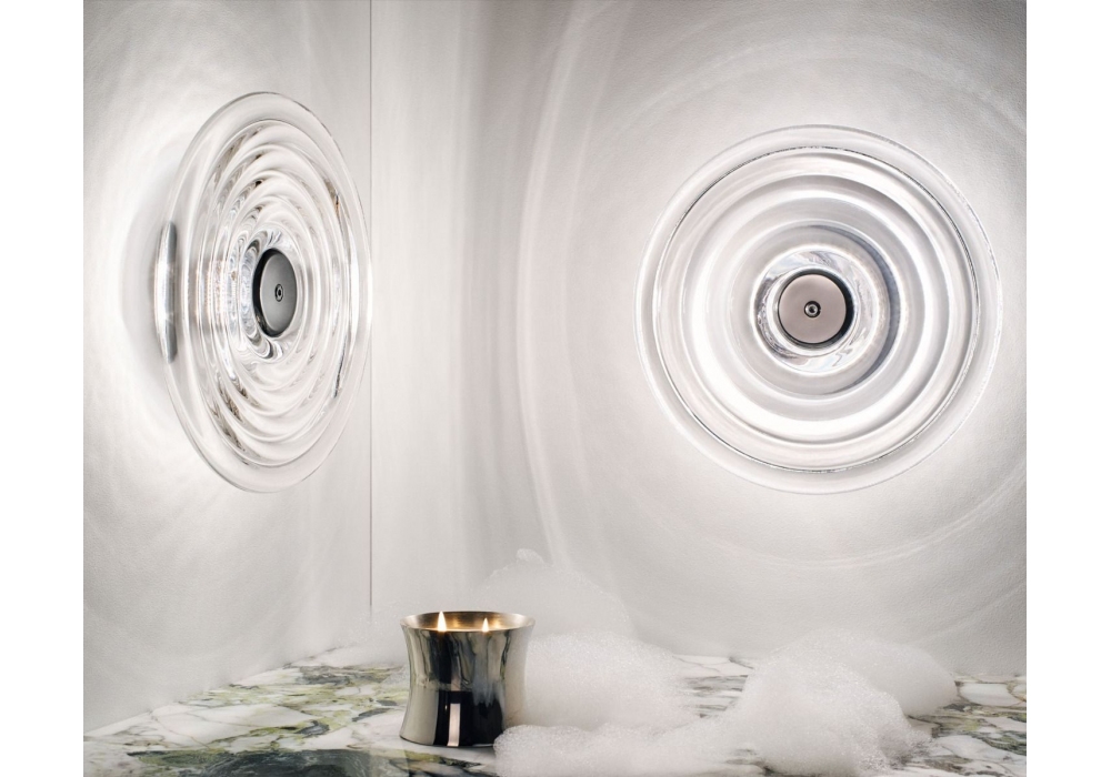 Press Surface diseñada por Tom Dixon es una lámpara de pared realizada en vidrio grueso y transparente con un detalle de superficie lineal redondeada.
