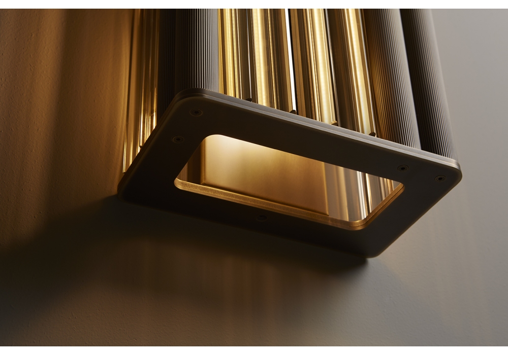 Numa diseñada por Massimo Tonetto para Venicem es una lámpara de pared de luz difusa. Estructura en latón bruñido oscuro y cristal de Murano soplado, cristal, ámbar o ahumado. El kit de atenuación se vende por separado.