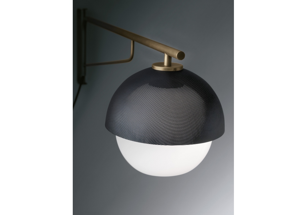 Urban Wall diseñada por Massimo Tonetto para Venicem es una lámpara de pared de luz difusa. También disponible en la versión "Turnig Arm" con brazo giratorio. Estructura de latón bruñido claro u oscuro con pantalla de metal perforado dorado mate o negro mate. Difusor de cristal de Murano soplado blanco. El kit de atenuación se vende por separado.
