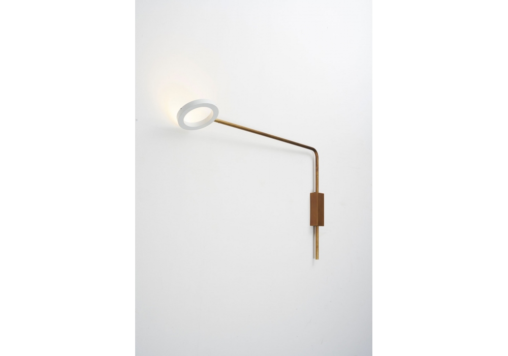 Meta diseñada por Franco Zavarise para Zava es una lámpara de pared con brazo (ajustable) realizada en hierro, aluminio o latón. La fuente de luz consiste en un anillo que contiene una luz LED. En la variante de latón, la base y el disco están