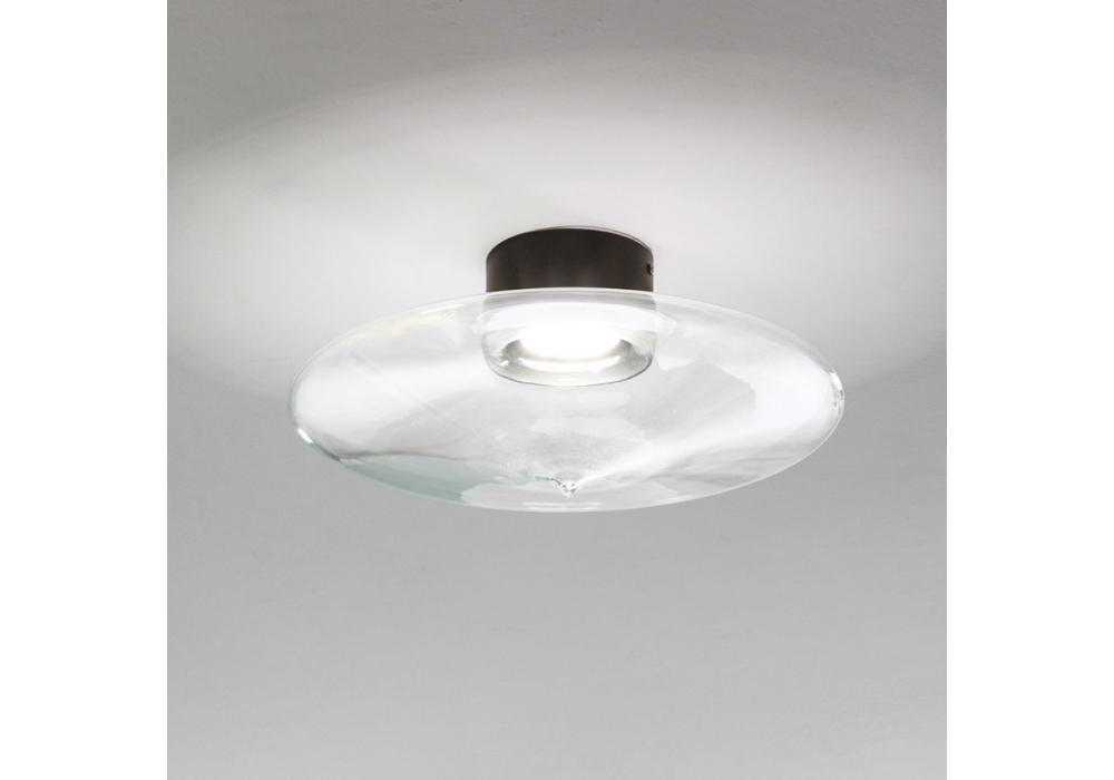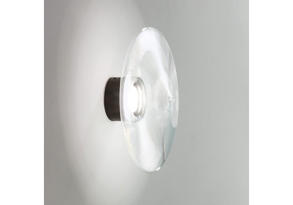 Desideria diseñada por Domenico Rinaldi para Fisionarte es una lámpara de pared o techo con estructura de metal en diferentes acabados. La pantalla es de cristal de borosilicato en acabado opaco o transparente y protege una fuente de luz LED regulable.