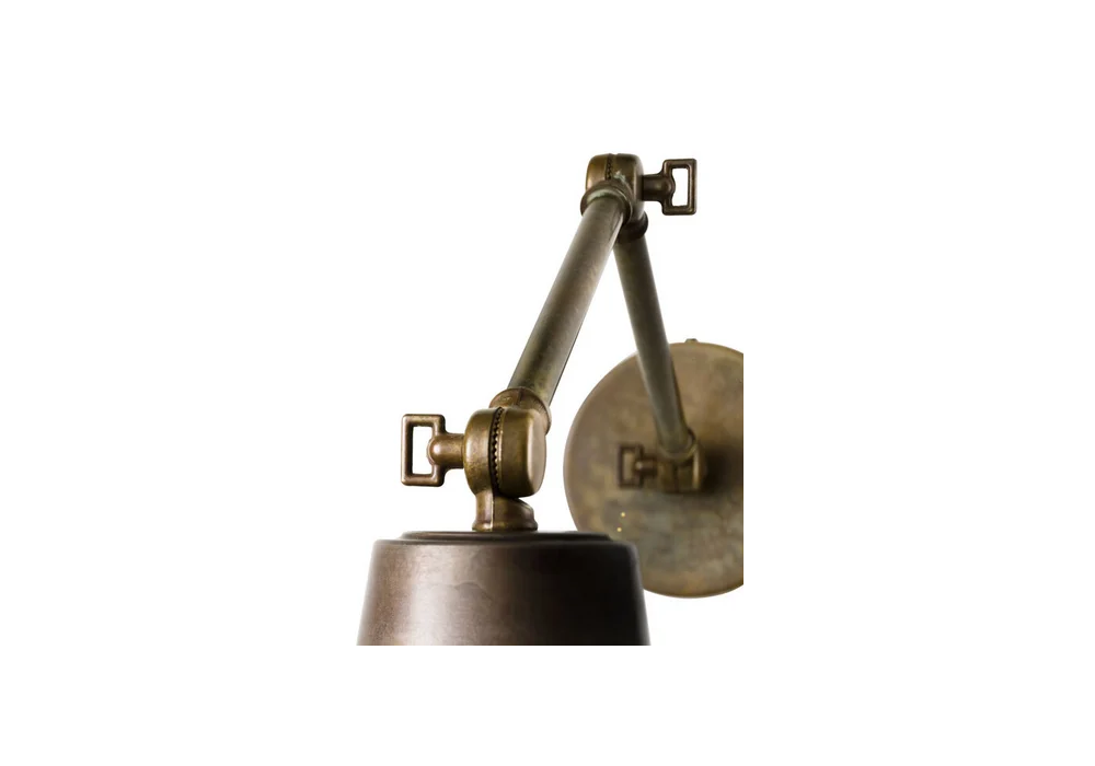Loft diseñado por Dt Studio para Il Fanale es un aplique con estructura de brazos móviles en hierro y latón. La pantalla es de forma circular y también está hecha de metal y protege una fuente de luz LED regulable.