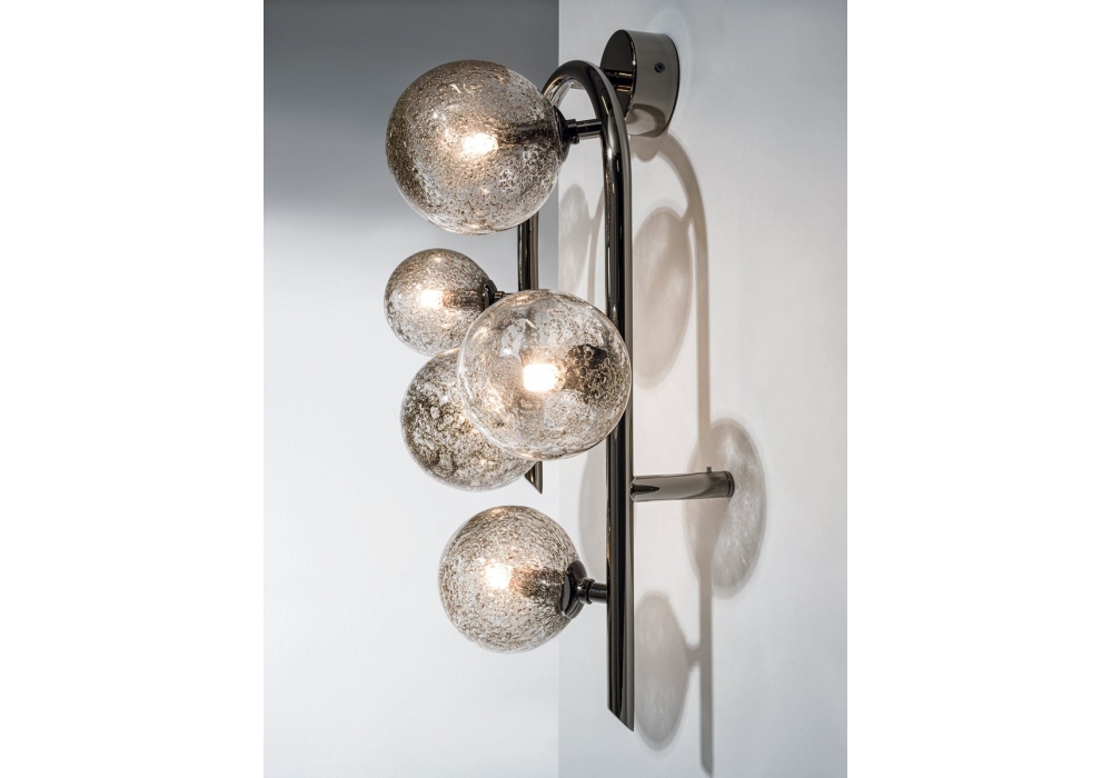 Rialto diseñada por Giuseppe Iasparra para Longhi es una lámpara de pared con estructura de metal en acabados galvánicos oro claro y níquel negro. Esferas de vidrio soplado de diferentes tamaños con inserciones de oro para la estructura en oro claro y latón para la versión en acabado níquel negro. Disponible en diferentes dimensiones.
