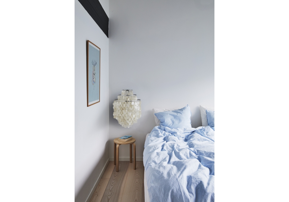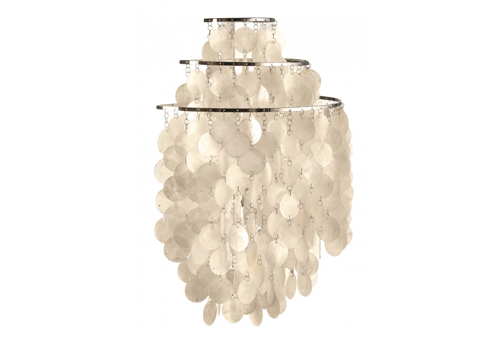 Fun diseñada por Verner Panton para Verpan es una lámpara de pared con discos de nácar sobre una estructura de metal cromado. Los discos están conectados entre sí gracias a pequeños anillos de metal. Hay un interruptor de encendido/apagado en el cable de alimentación (transparente).