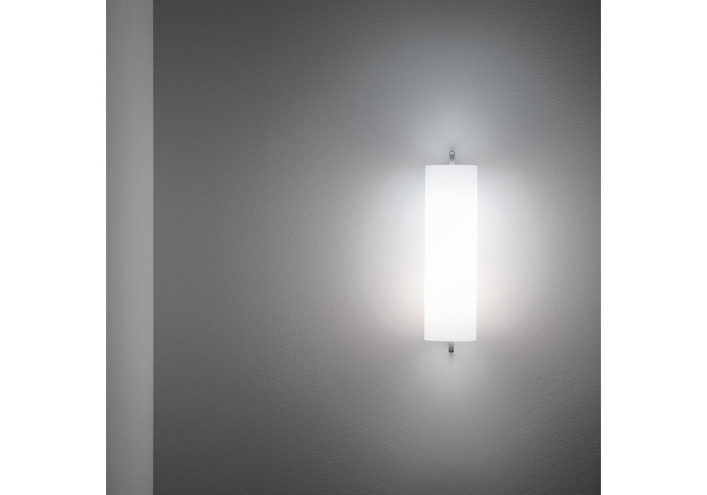 Phi diseñada por Filippo Taidelli para Firmamento Milano es una lámpara de pared de luz difusa realizada con un difusor de vidrio soplado opalino grabado al ácido y una estructura de aluminio níquel satinado.