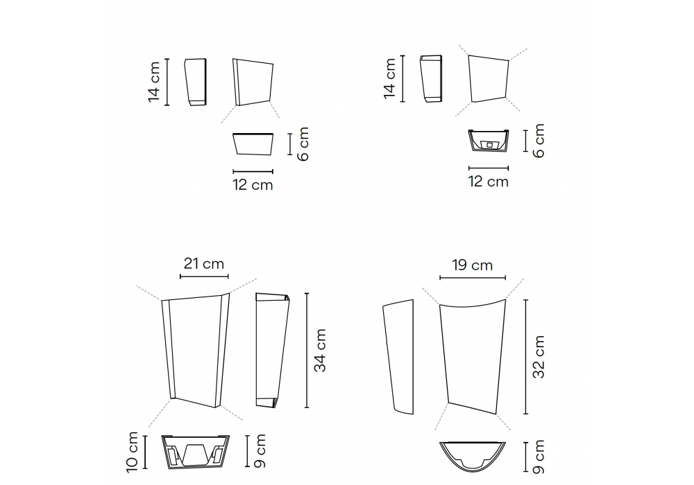 | Dimensiones | 12 x 6 x H 14 cm; 12 x 6 x H 14 cm; 21 x 10 x H 34 cm; 19 x 9 x H 32 cm. |