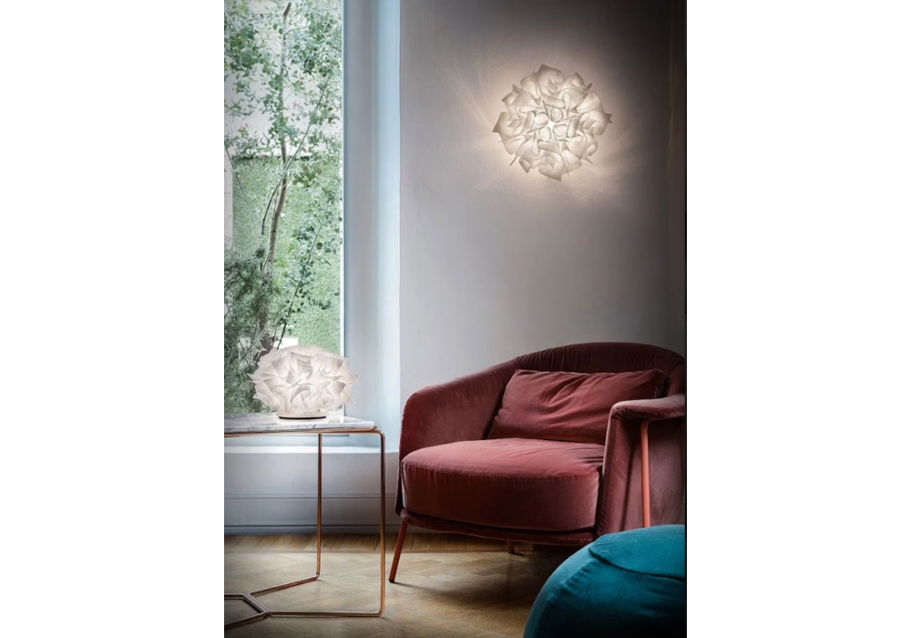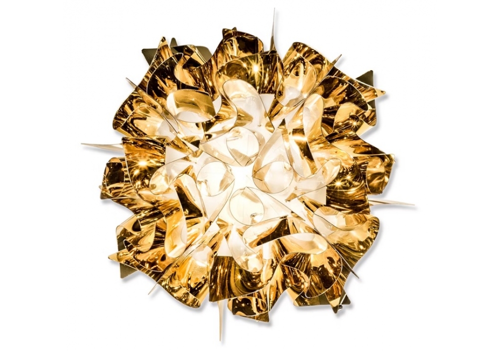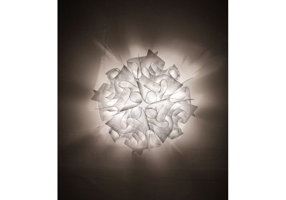 Veli diseñada por Adriano Rachele para Slamp es una lámpara de techo o de pared de forma abstracta realizada en Opalflex®, Lentiflex®, Goldflex®, Steelflex®, Copperflex®. La fuente de luz utilizada es del tipo LED de filamento regulable. Veli está disponible en diferentes tamaños y acabados.