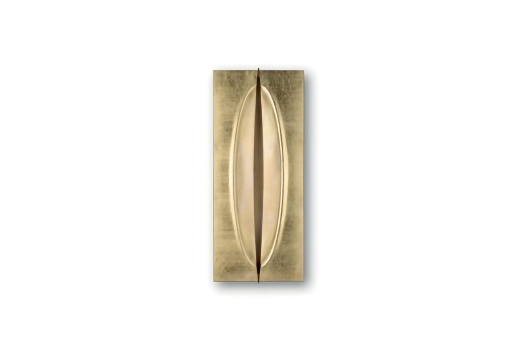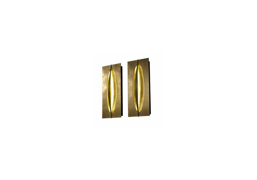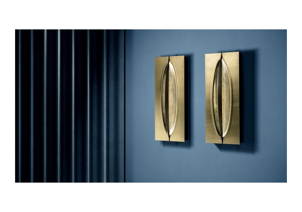 Terra diseñada por Reflex Angelo es una lámpara de pared realizada en cristal extraclaro con tratamiento de pan de oro. Estructura de metal con acabado latón y aspa vertical de latón bruñido.