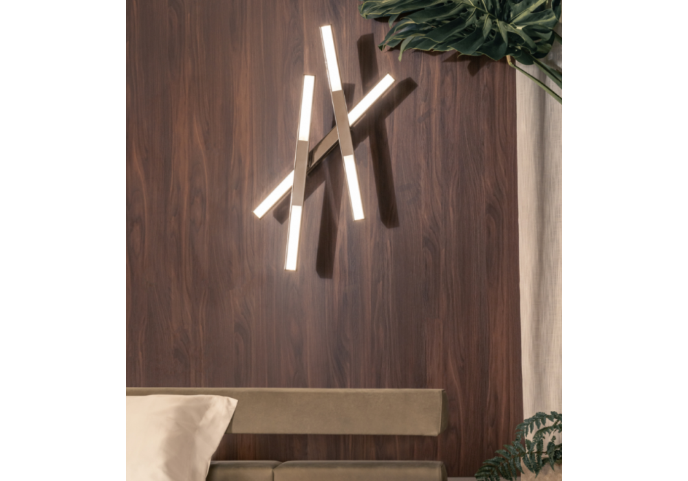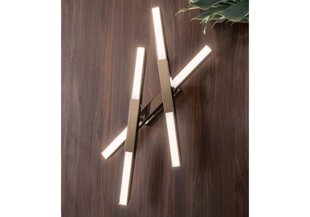 Pagano diseñada por Moitié Studio para Casamilano es una lámpara de pared compuesta por 3 barras luminosas en acabado cromo pulido o alpaca al ácido.