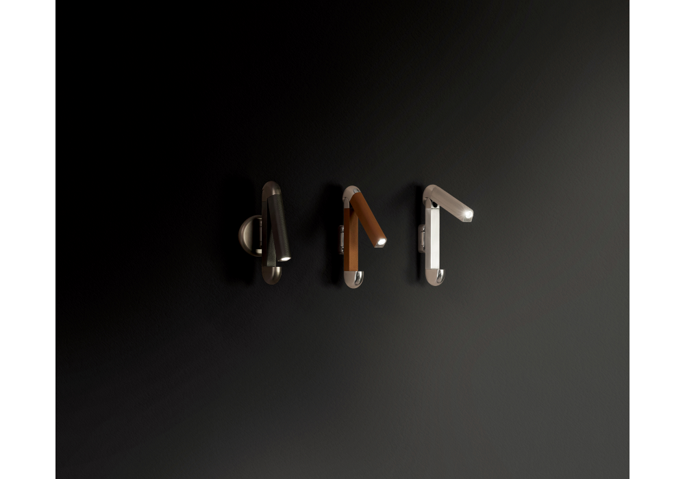 Picchio diseñada por Alessandro Munge para Contardi es una lámpara de pared equipada con un módulo LED con controlador integrado o remoto. Su estructura es de aluminio pulido o bronce cepillado, con detalles de piel opcionales en color coñac (para aluminio) o café (para bronce). También disponible sin inserciones de piel.