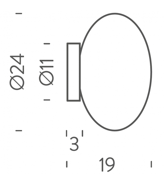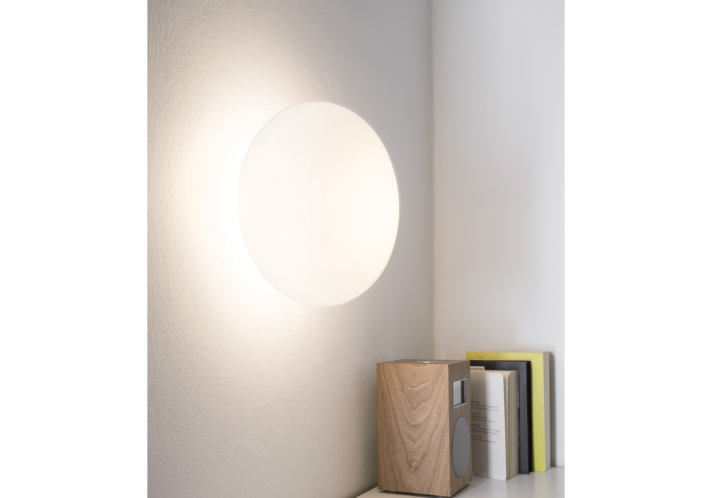 Maga producida y diseñada por Nemo es una lámpara de pared/plafón con anclaje en material plástico y difusor circular en vidrio soplado opalino. La fuente de luz adoptada es con un accesorio E14 halógeno/LED/Fluo.