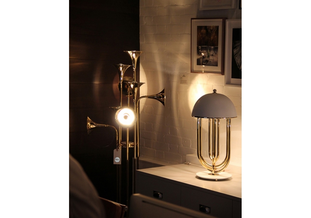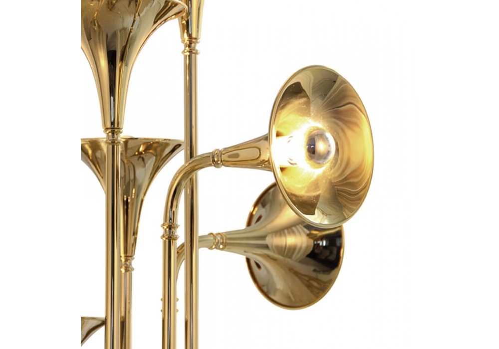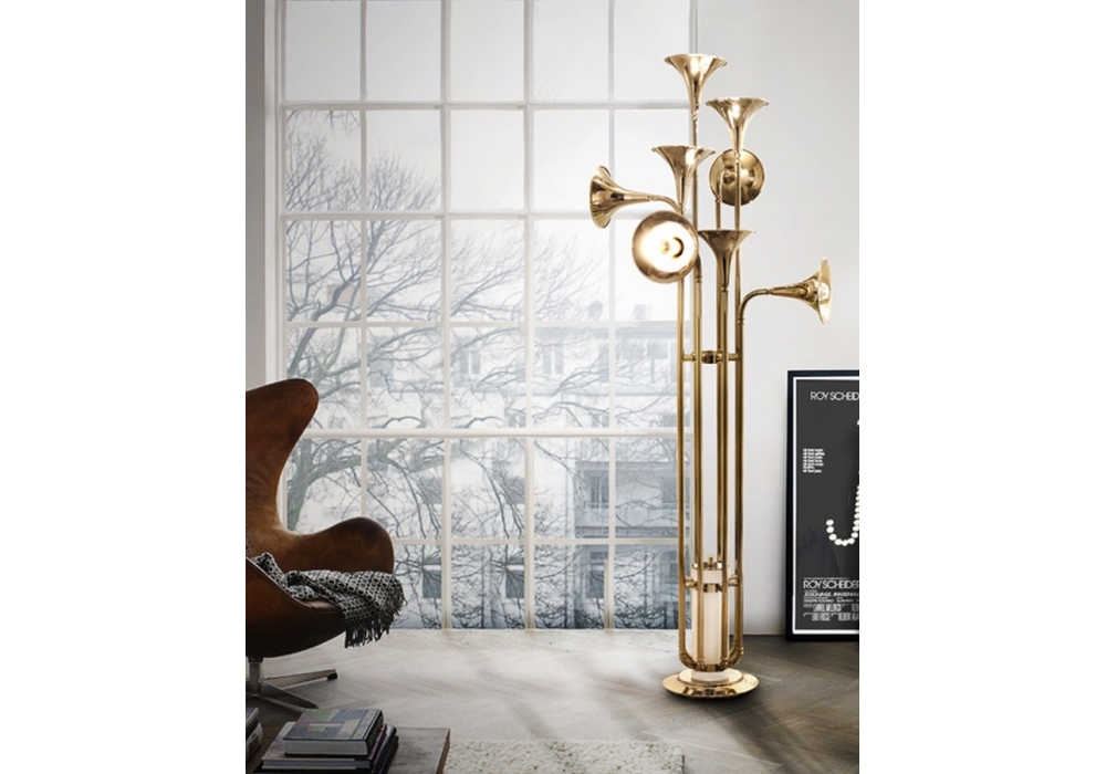 Botti diseñada por DelightFULL es una lámpara de pie hecha a mano en latón con un acabado chapado en oro que se asemeja a una trompeta real gracias a su forma única.