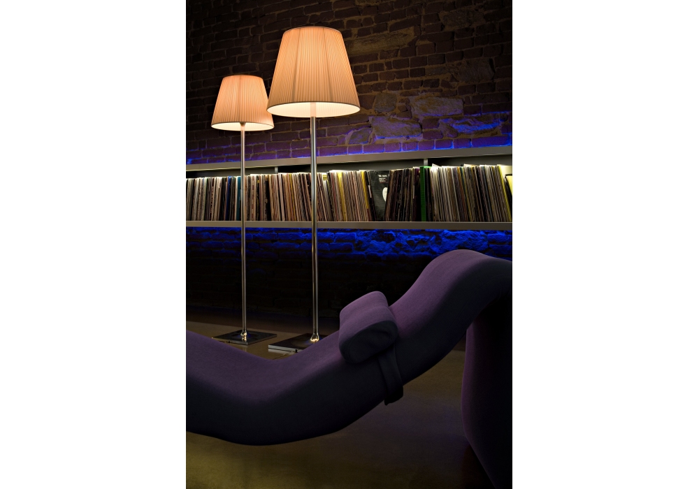 Ktribe F3 diseñada por Philippe Starck para Flos es una lámpara de pie de luz difusa con un diseño refinado y moderno. La estructura se compone de una base, una varilla de soporte y un soporte difusor de aleación de zamak fundido a presión, pulido y cromado, con una base recubierta de chapa de acero galvanizado. El difusor interno y el soporte del portalámparas son de policarbonato opalino moldeado por inyección. El cable cuenta con un regulador electrónico que permite regular la intensidad de la luz gradualmente. Bombilla no incluida.