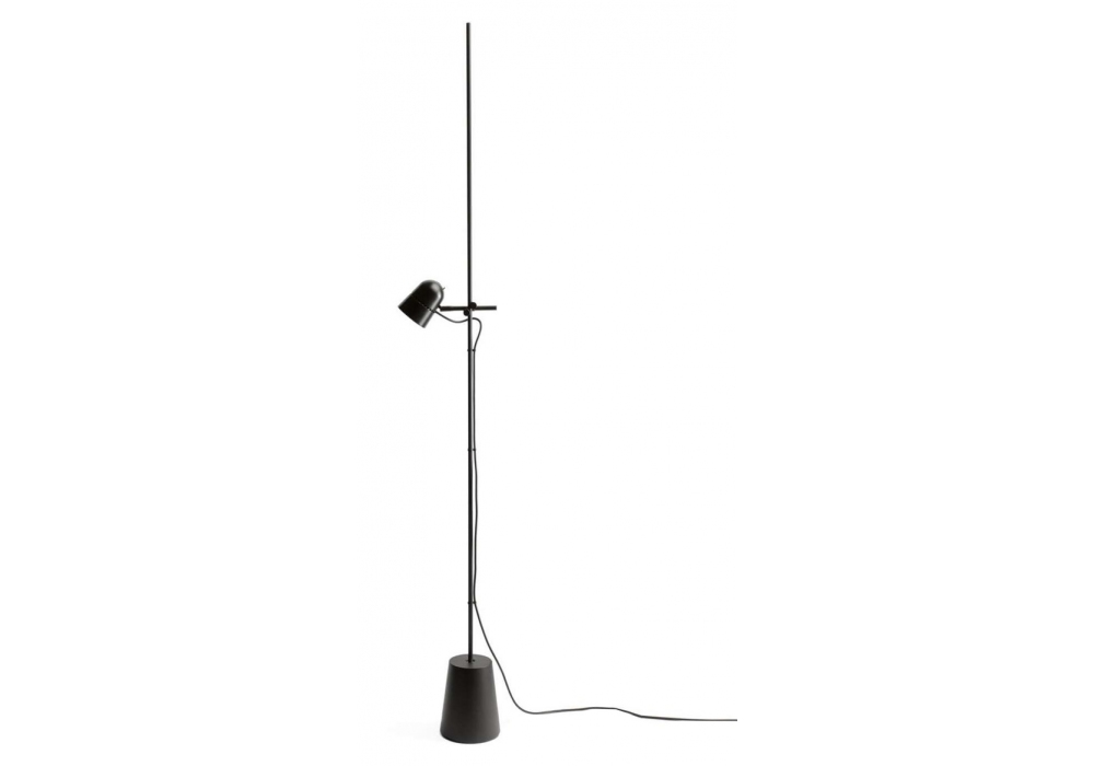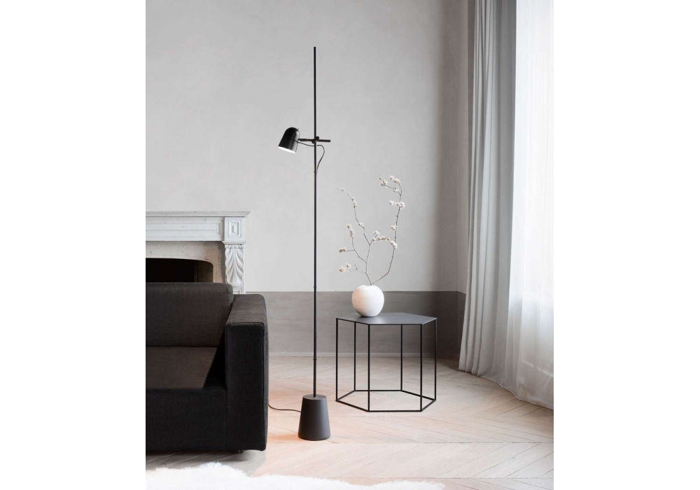 Counterbalance Floor diseñada por Daniel Rybakken para Luceplan es una lámpara de pie con estructura en acero pintado de negro y reflector de cúpula de aluminio regulable en altura gracias a un mecanismo deslizante a lo largo del vástago.